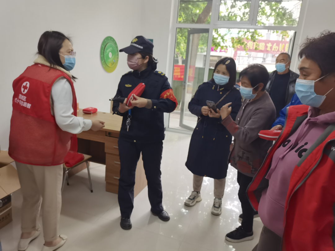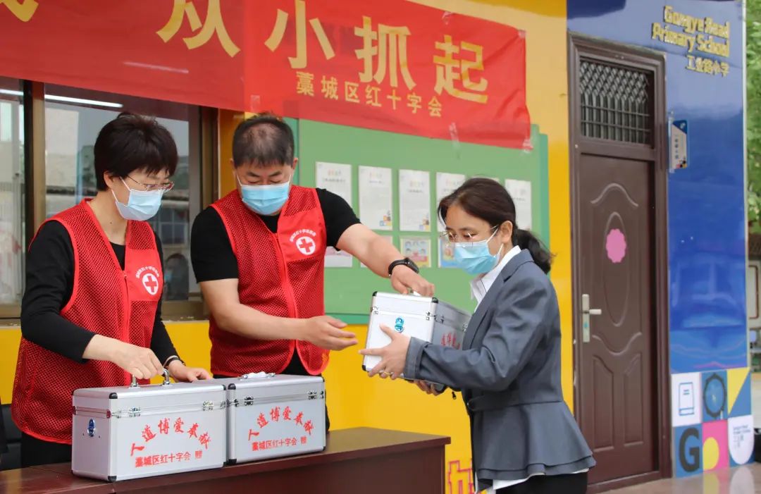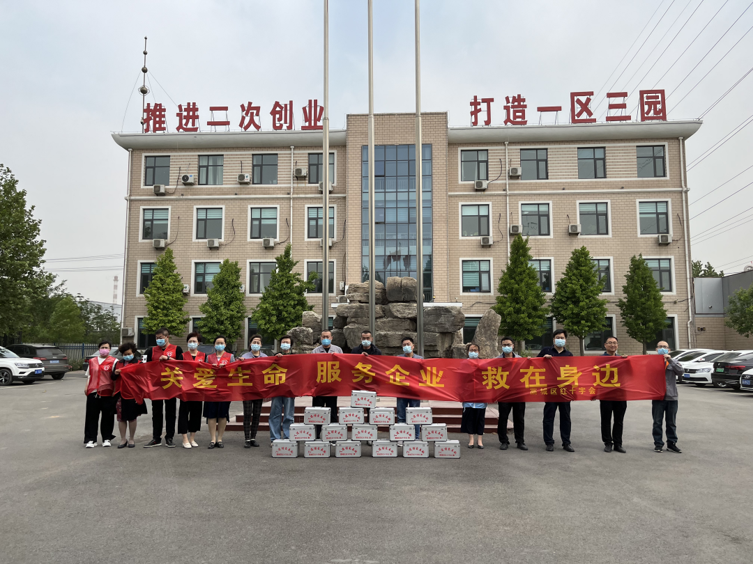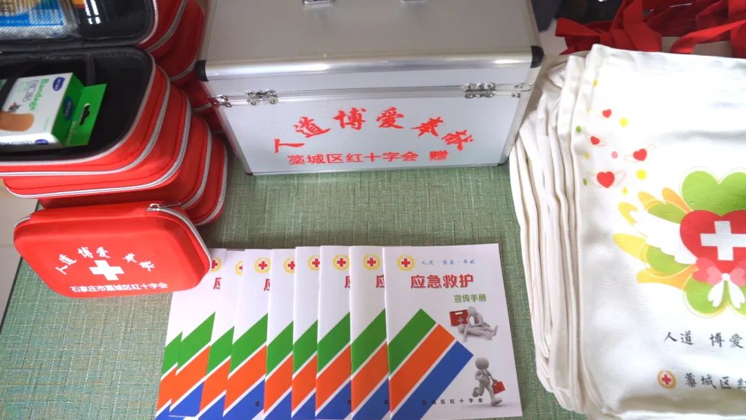 藁城区红十字会为区工业路小学共捐赠37个急救箱,确保每个班级有1个急救箱,并贴心地为学生讲解了急救箱使用方法,让每个小朋友心中都种下关爱生命和应急救护的种子,能够健康成长。 藁城区红十字会向藁城区工业路小学捐赠急救箱。 藁城区红十字会向藁城区工业路小学捐赠急救箱,教授学生箱内物品使用方法。 进企业—“关爱生命、服务企业、救在身边” 藁城区红十字会向藁城经开区的企业捐赠了急救箱,并讲解了急救知识,帮助企业职工树立“人人学急救、急救为人人”的理念,为构建平安企业作出努力。 藁城区红十字会为藁城经开区企业捐赠急救箱 进社区—“用心呵护生命,用爱传递温度” 藁城区红十字会在西城街社区举办了“用心呵护生命,用爱传递温度”宣传活动,还举办了志愿者急救知识培训,向前来办事群众讲解急救知识。 西城街社区宣传活动