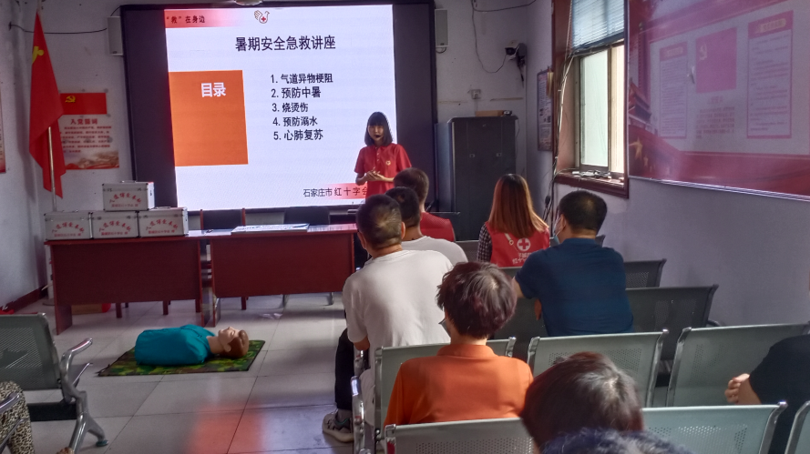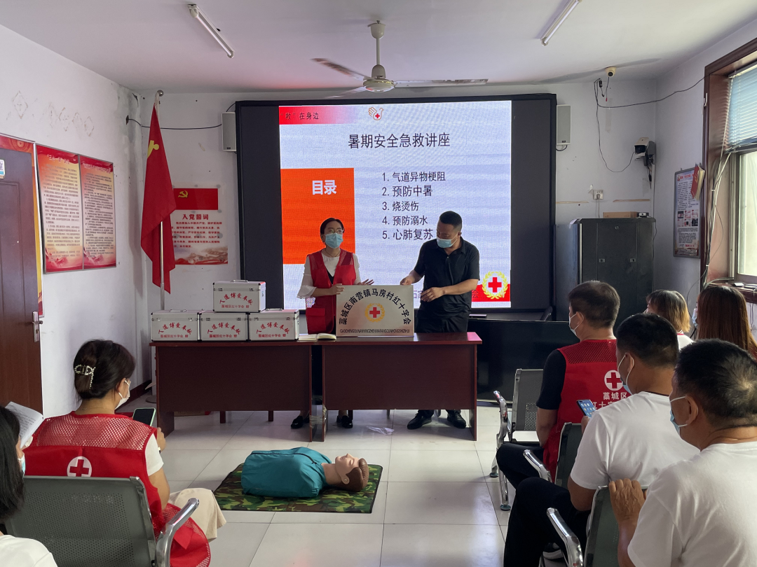 7月22日,藁城区红十字会为马房村红十字会基层组织授牌,捐赠急救箱,邀请石家庄市红十字卫生救护培训中心专业讲师到马房村普及应急救护知识。